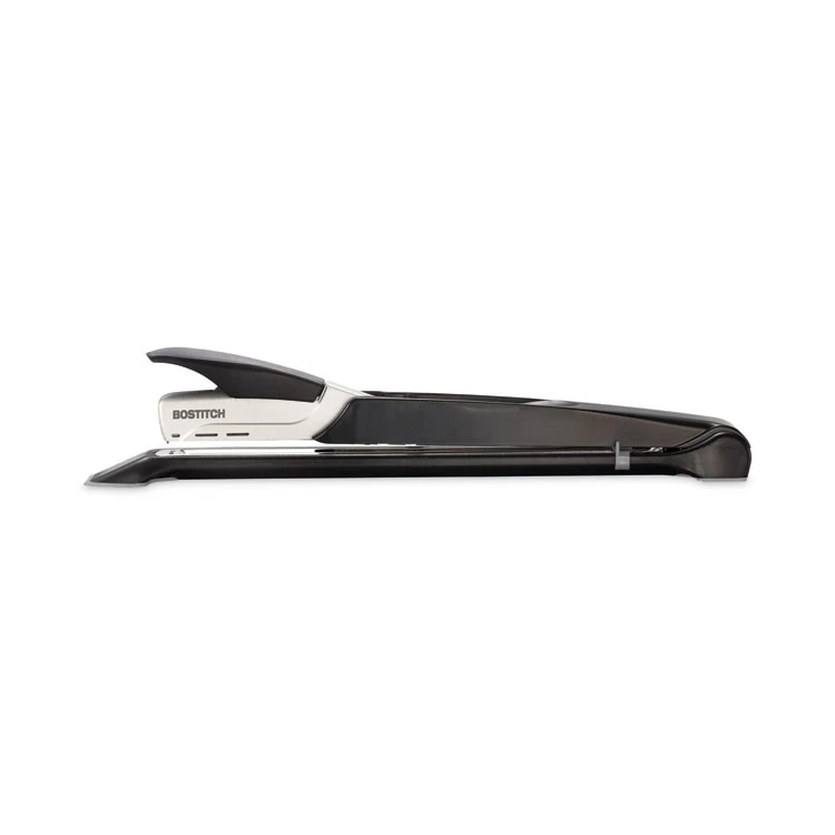 Paperwork can be a hassle but stapling it shouldn’t be. With the Bostitch Long Reach Antimicrobial* Stapler’s uniquely effortless one-finger technology by PaperPro®, experience fast and easy, jam-free stapling for your brochures, pamphlets, binding, and more. 80% easier than standard staplers, all it takes is the press of a finger to fasten up to 25 sheets. Boasts a 12.5” long reach and ability to bind sheets up to 25” wide, plus a built-in ruler and sliding paper guide to ensure consistent staple placement. For demanding environments, the sophisticated die-cast metal housing delivers impressive performance while the base’s non-slip grip protects your desktop and provides stability during use. With a curved, ergonomic handle shape that positions perfectly in the palm of your hand, dominate your stapling stacks without missing a sheet. Full strip (210) staple capacity; uses standard staples. For optimal performance, use with Premium Standard Staples (1901). Antimicrobial properties built-in to protect the product with Agion® silver ion-based agent. Agion® is a registered trademark of Sciessent®.